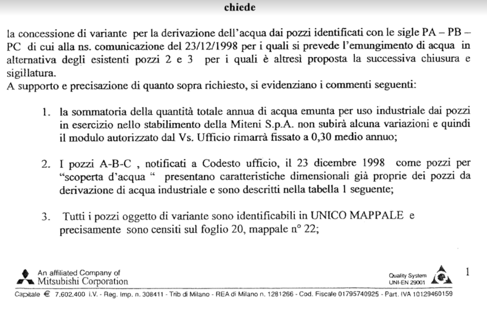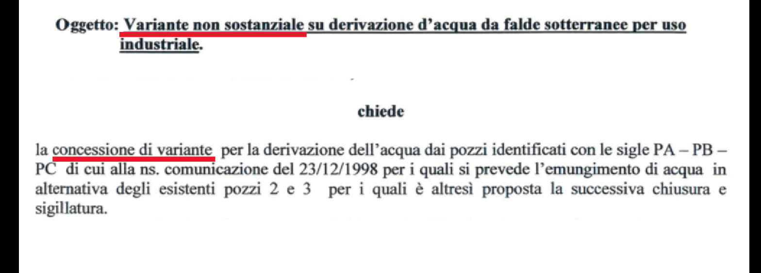 Quella controprova ora ce l’abbiamo, perfettamente corrispondente, firmato dall’attuale Direttore del Genio Civile, in ottemperanza alla legge sulla trasparenza degli atti pubblici. Dove si evince, da entrambi i documenti – sia quello nostro del punto 1, sia dalle righe sopra riportate – che si chiede una variante di derivazione delle acque di una concessione del 23/12/1998 che di fatto era già una barriera idraulica, come dichiarato nero su bianco nel nostro documento iniziale. Variante che nell’oggetto della missiva di Fabris diventa, diversamente dal corpo del testo (curiosa anche questa sottigliezza omissiva), “non sostanziale”, quando invece quella variante sarà, come dimostreremo, non solo sostanziale, ma addirittura radicale. Si legge infatti nella riga di richiesta: «concessione di variante per la derivazione delle acque».