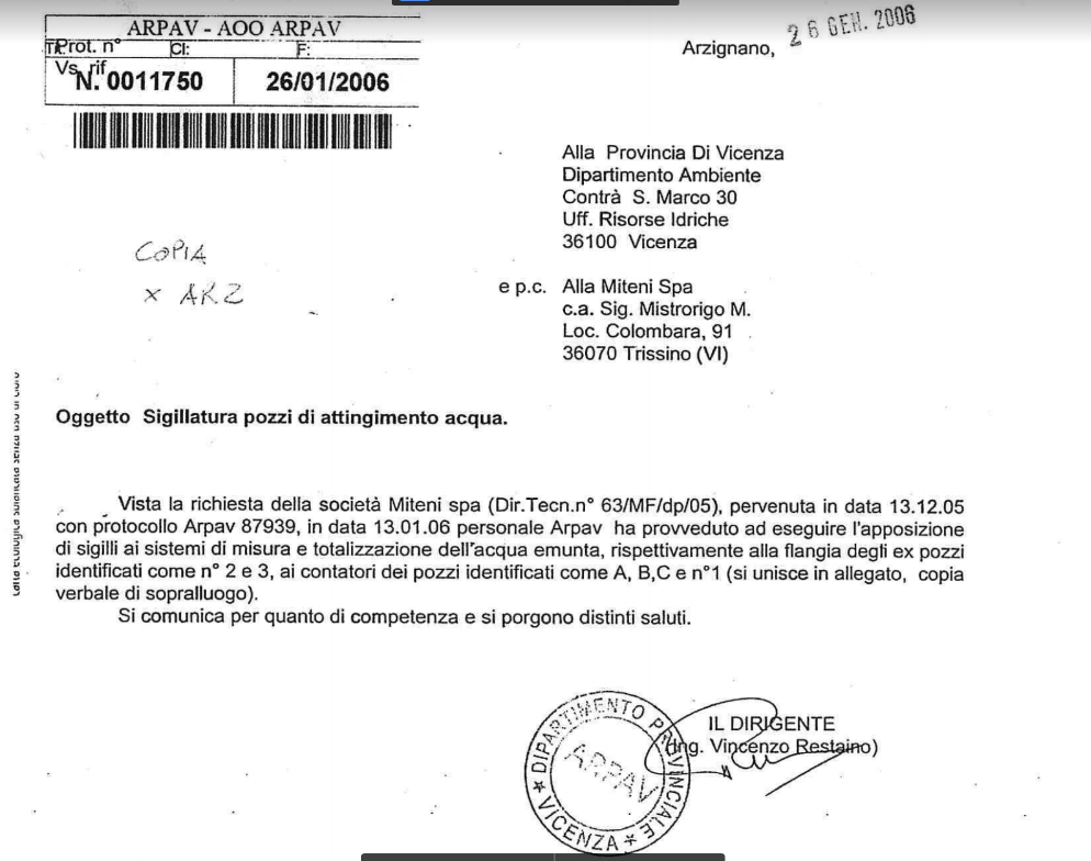 Lo stesso documento di richiesta – probabilmente “volutamente” modificato – è poi stato passato all’Arpav, la quale fatica sempre più a nascondersi dietro all’equivoco pozzo di emungimento/barriera idraulica e pone seri dubbi proprio su questo passaggio, altrimenti la difesa sarebbe chiara e limpida. Ammettiamo pure che per modifica volontaria, errore o negligenza – sempre colpe sono, la prima già dolosa – abbia non recepito o, se recepito, non letto l’allegato della ERM. È irrilevante. Al senso di giustizia non si può negare un dato di fatto: che la barriera fosse chiaramente citata e che in qualche modo i riceventi i documenti – Regione, Genio Civile, Arpav, Sindaco di Trissino – fossero a conoscenza della barriera e che quindi la Miteni stava potenzialmente inquinando. E soprattutto che questi enti – collegati tutti da un ufficio superiore, l’Assessorato all’Ambiente – non abbiano fatto nessun controllo, verifica, accertamento, per molti anni, di fronte a una fabbrica già colpevole di un disastro ambientale. Non solo, che si siano limitati alla puerile giustificazione – come presto vedremo – «se non cerchi non trovi», e quindi al semplice sigillo di un pozzo di emungimento. Sono proprio questa giustificazione e la successiva negazione che fanno pensare al dolo.