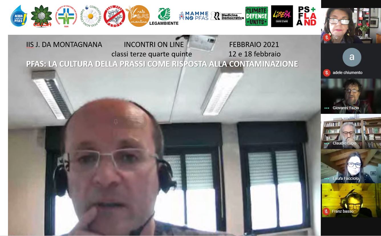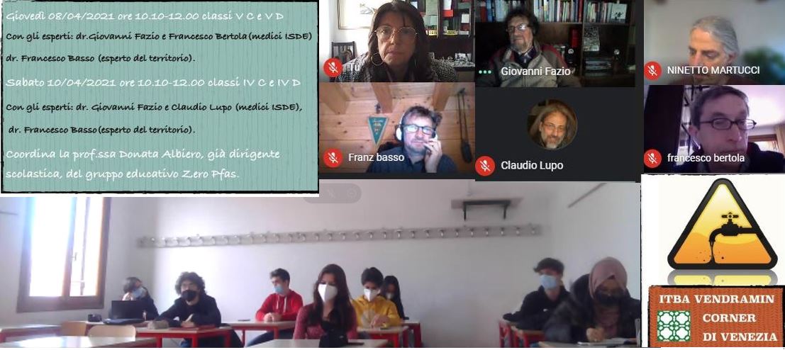 Per il dialogo con gli studenti, negli incontri on line, sia all’IIS “Jacopo Da Montagnana”, che al “Vendramin Corner” di Venezia, abbiamo utilizzato la chat o la diretta tramite microfono quando gli studenti erano in presenza nelle classi. Gli apprezzamenti espressi dai nostri attenti interlocutori e il consenso dei docenti ci hanno convinto di aver centrato il bersaglio. Gli esperti hanno, ancora una volta, dimostrato di essere una squadra affiatata e con spirito di equipe. Abbiamo anche scoperto di avere una marcia in più rispetto agli altri anni. Nei sondaggi, facenti parte dell’indagine preliminare, l’interesse per l’argomento delle riunioni era stavolta a livelli molto più alti rispetto agli anni passati: circa il 75%. Le motivazioni di ciò, addotte dai ragazzi, erano che ritenevano importante la tematica da trattare per la loro vita futura, a prescindere dal fatto che abitassero o meno nella zona inquinata. È stato significativo e per me emozionante, quando, all’IIS “Jacopo Da Montagnana”, nel bel mezzo del dibattito sulle problematiche generate dai Pfas, i ragazzi di una classe, hanno chiesto, tramite docente che chattava con noi, come diventare cittadini attivi e a quali comitati, associazioni del Movimento No Pfas avrebbero potuto rivolgersi per offrire un personale contributo di impegno.