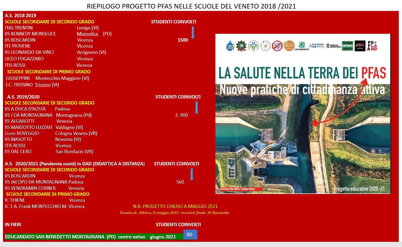 Grazie alla credibilità che i nostri relatori coinvolti nel progetto hanno acquisito negli anni passati, negli ultimi quattro mesi siamo stati invitati in cinque scuole. L’IIS (Istituto Istruzione Superiore) Boscardin (VI) ha aderito in toto al progetto educativo «LA SALUTE NELLA TERRA DEI PFAS. Nuove pratiche di cittadinanza attiva», mentre altre scuole hanno sollecitato “informative”, pillole mirate sulla tematica Pfas, rinviando a tempi migliori il più impegnativo percorso dell’intero progetto. Di seguito la lista: