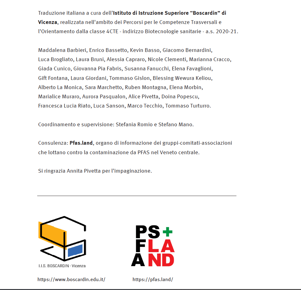 L’autorizzazione preventiva alla traduzione e alla pubblicazione della monografia che ora potrete leggere in PDF anche in italiano è stata fornita da Felix Poetschke, capo redattore della rivista What Matters, che è stato ben felice dell’interesse per l’articolo e dell’entusiasmo degli studenti per il progetto. Da segnalare le note di traduzione e di redazione, dove vengono suggeriti gli approfondimenti e i punti deboli non aggiornati dell’esposizione tedesca, in particolare gli studi sull’incenerimento dei PFAS, oggetto in questi ultimi mesi di nuove acquisizioni scientifiche, dopo i fatti di inquinamento atmosferico in USA e il tentativo che si è fatto o si vuole continuare a fare in Italia per perseguire una strada sbagliata. Senza uscita. Quello dello spostamento del problema dall’acqua all’aria.