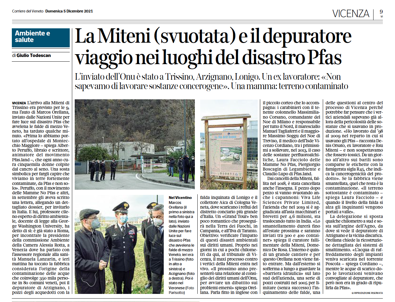 Il 13 dicembre 2021 si è chiusa ufficialmente all’Istituto Sturzo di Roma la visita degli inviati dell’Alto Commissariato ONU in Italia, con focus sul Veneto e la contaminazione da Pfas. Marcos Orellana – Special Rapporteur delle Nazioni Unite sulla violazione dei diritti umani in relazione alle sostanze tossiche – nella sua relazione finale sottolinea l’assenza di trasparenza e la scarsa condivisione delle informazioni con la popolazione contaminata da parte delle autorità regionali del Veneto. In estrema sintesi, come rilasciato al microfono della RAI a Roma, afferma: «Le persone non sono state in grado di prendere anche quel minimo di precauzione che avrebbero potuto prendere per arginare questo rischio». Un dato di fatto per noi gravissimo. Con delle conseguenze incommensurabili sulla salute e la civiltà dei nostri luoghi.