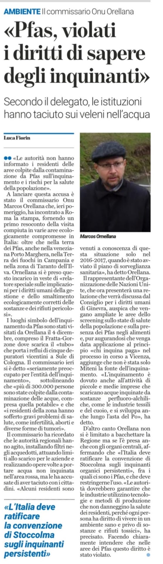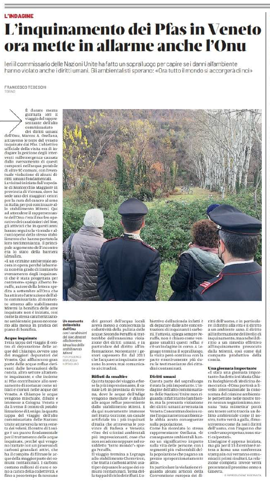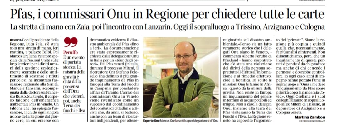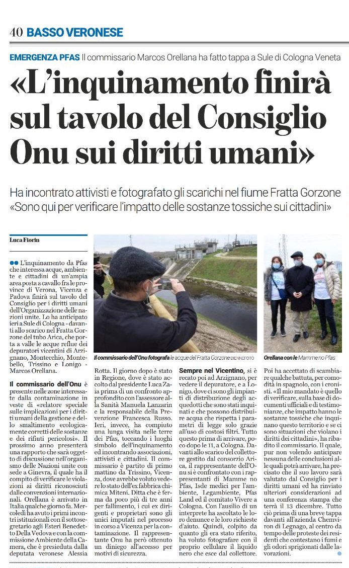 Un passo delle parole di Marcos Orellana sul comportamento delle autorità regionali, dal documento ufficiale: «However, authorities failed to warn the residents of the affected areas and disseminate the information about the PFAS pollution and the risks to their health». Tradotto: «Tuttavia, le autorità non hanno avvertito i residenti delle aree colpite e non hanno diffuso le informazioni sull’inquinamento da PFAS e sui rischi per la loro salute».