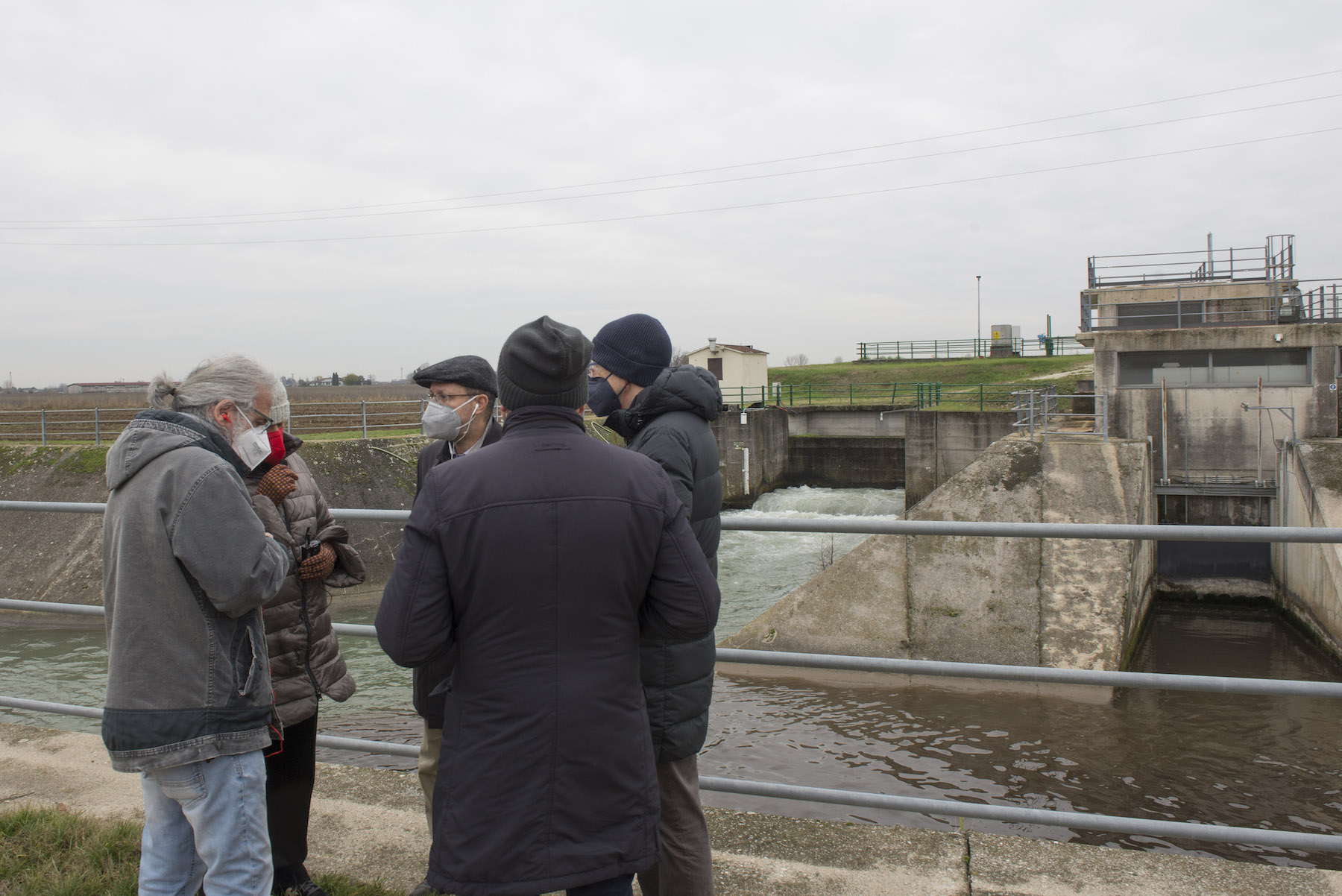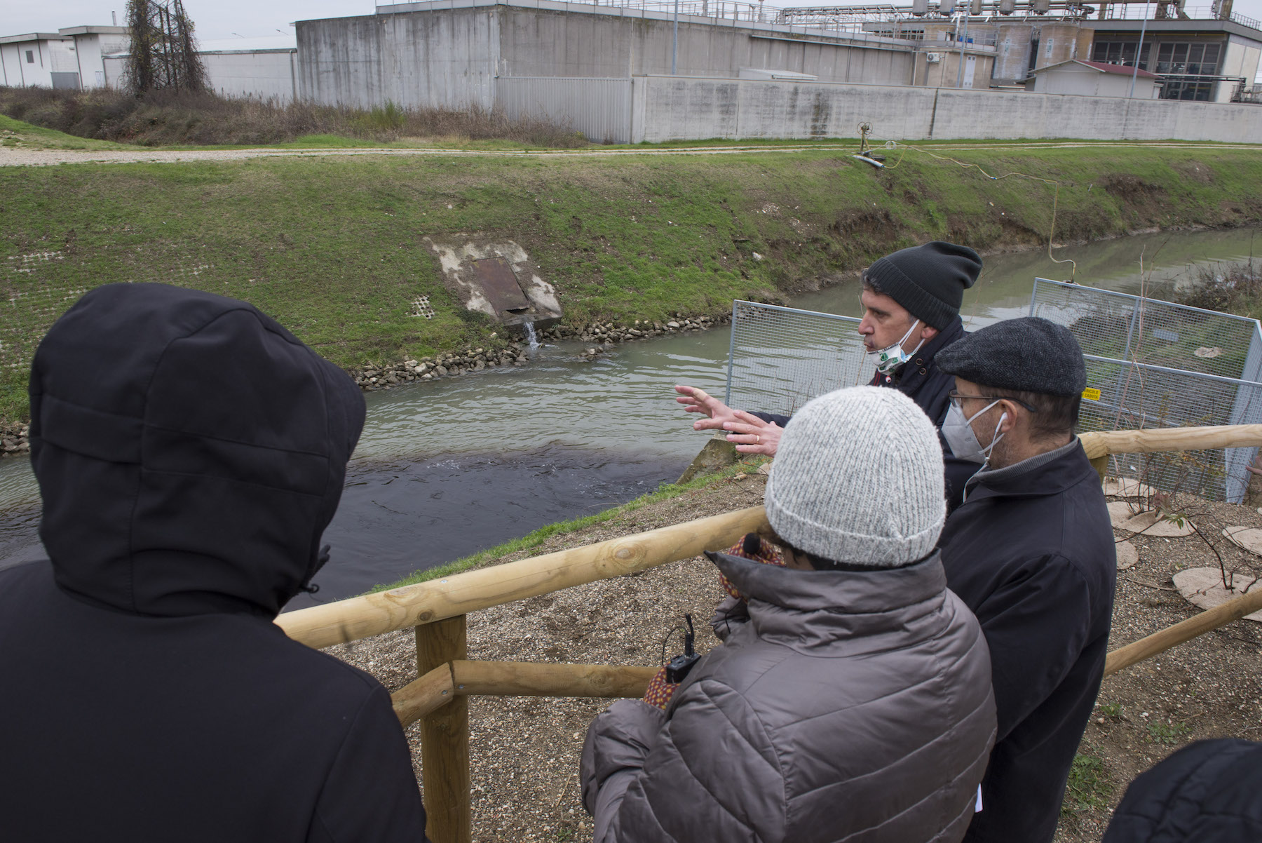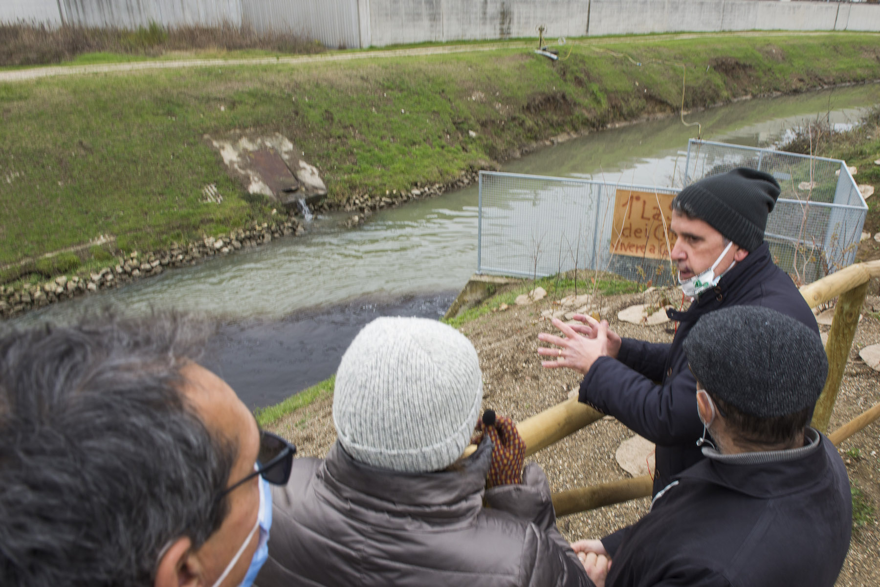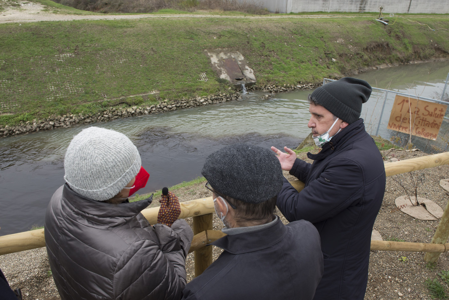 FOTO COVER di Federico Bevilacqua>> Vincenzo Cordiano e Piergiorgio Boscagin spiegano a Marcos Orellana la “vivificazione” [l’inganno semantico di una diluizione criminosa] del Tubone Arica con il Canale LEB, sul Fratta Gorzone. 4 dicembre 2021, Cologna Veneta.