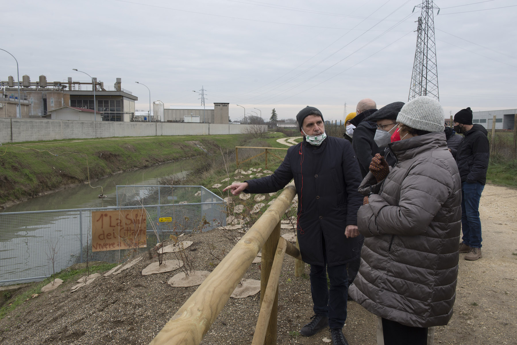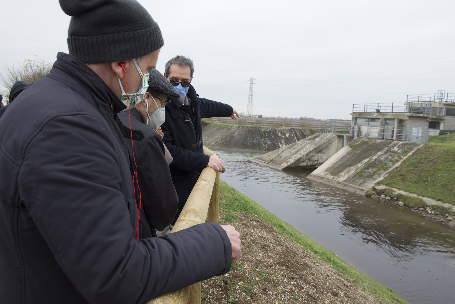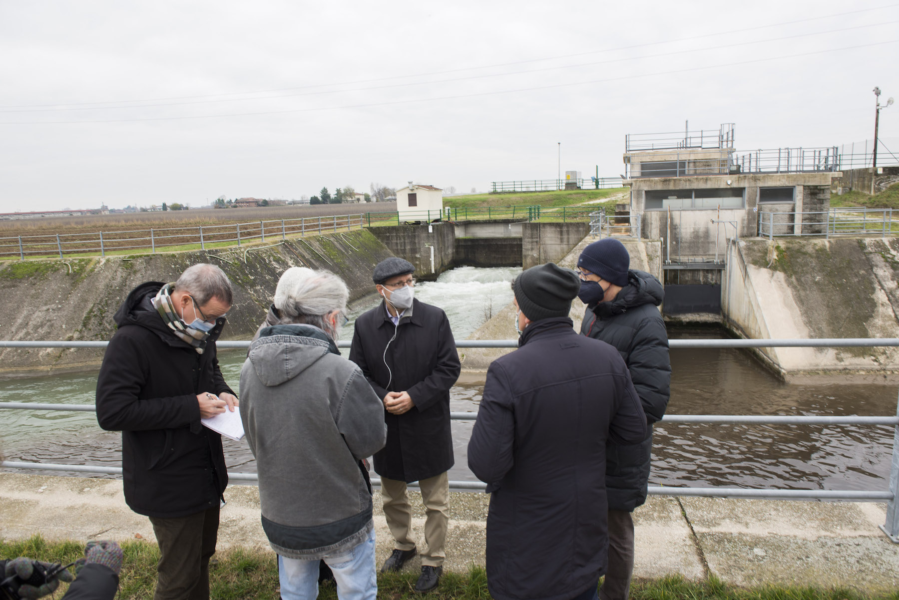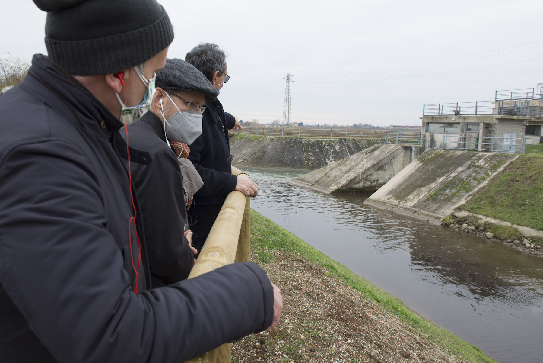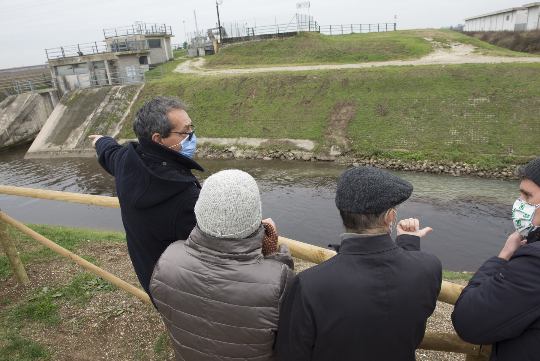 FOTO COVER di Federico Bevilacqua>> Vincenzo Cordiano e Piergiorgio Boscagin spiegano a Marcos Orellana la “vivificazione” [l’inganno semantico di una diluizione criminosa] del Tubone Arica con il Canale LEB, sul Fratta Gorzone. 4 dicembre 2021, Cologna Veneta.