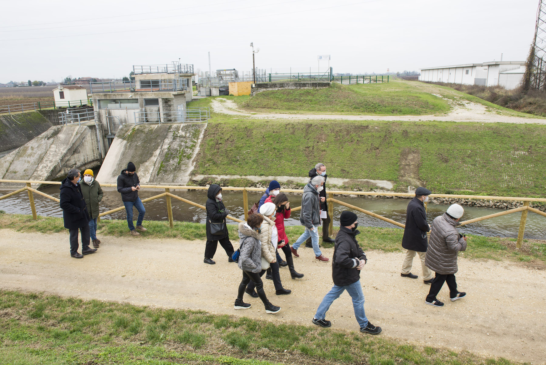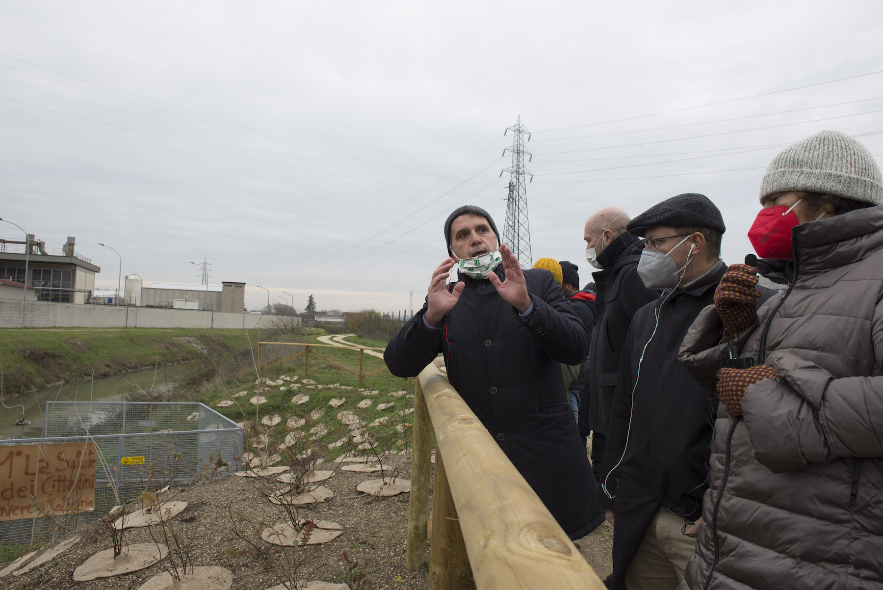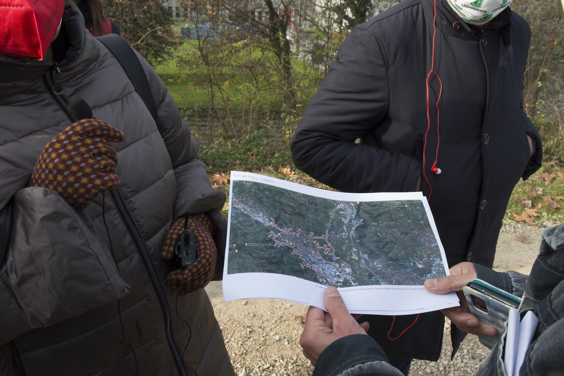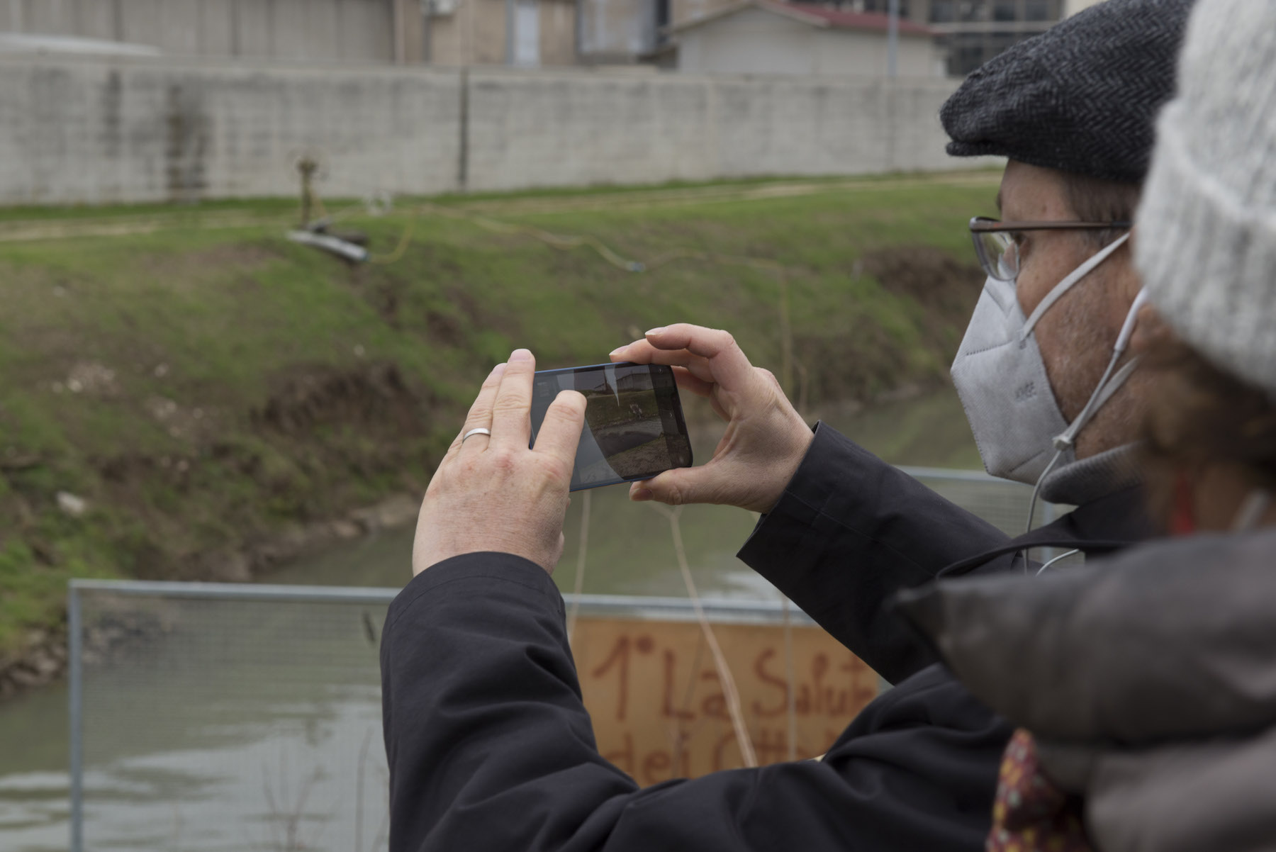 FOTO COVER di Federico Bevilacqua>> Vincenzo Cordiano e Piergiorgio Boscagin spiegano a Marcos Orellana la “vivificazione” [l’inganno semantico di una diluizione criminosa] del Tubone Arica con il Canale LEB, sul Fratta Gorzone. 4 dicembre 2021, Cologna Veneta.