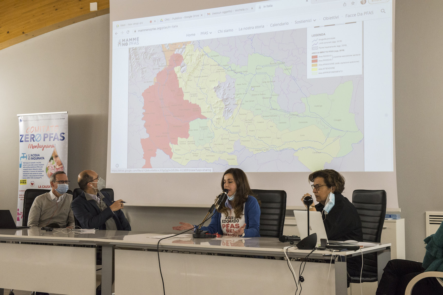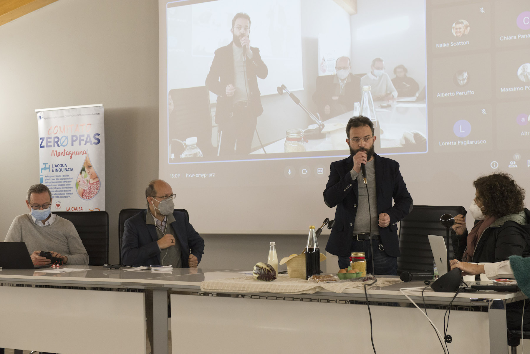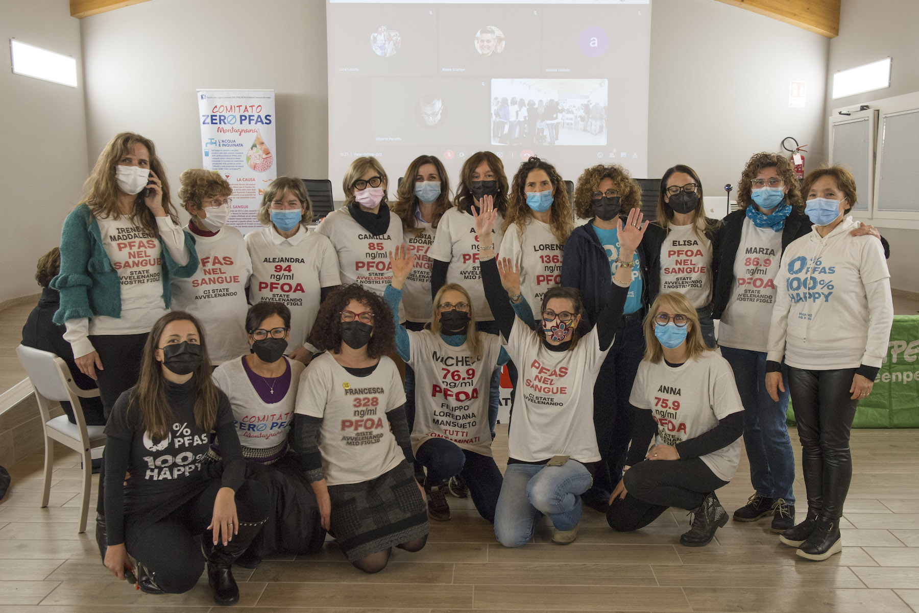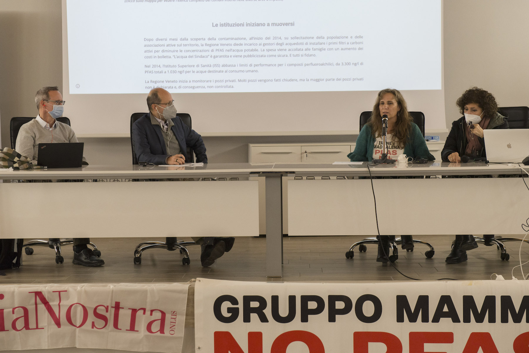 Infine, ricordiamo la chiusura in remoto del regista della Missione ONU, Alberto Peruffo, che dalla sede operativa di PFAS.land – la Libreria La Casa di Giovanni – causa quarantena Covid del figlio – ha ricordato all’assemblea questo punto fondamentale: «Il concetto di corresponsabilità. Sottolineo che un crimine ambientale di così vaste proporzioni può accadere solo se i tre gradi della catena di responsabilità sono fortemente connessi: 1. CHI PRODUCE (la Miteni); 2. CHI PERMETTE (gli enti di permesso: Comune, Provincia e Regione); 3. CHI CONTROLLA (gli enti e le agenzie di controllo: Regione: Genio Civile, Arpav, Spisal, Ulss). Solo questi tre elementi “collusi” insieme possono creare uno dei più grandi inquinamenti della storia recente».