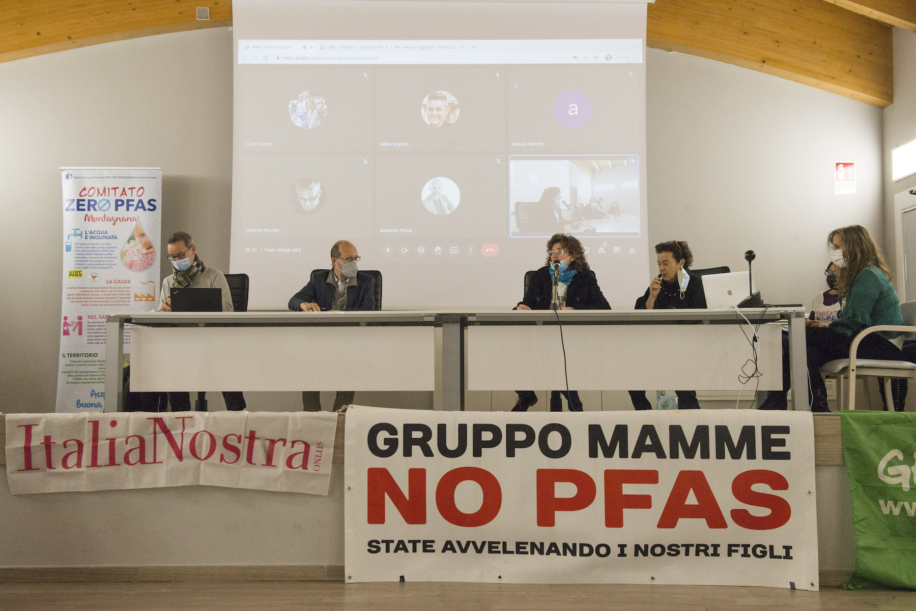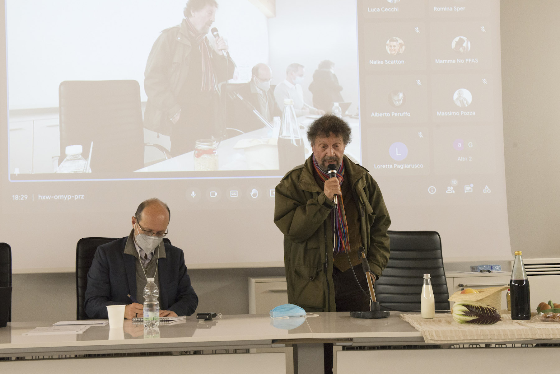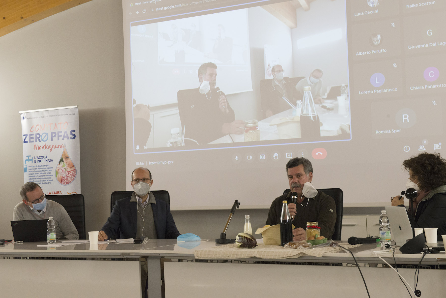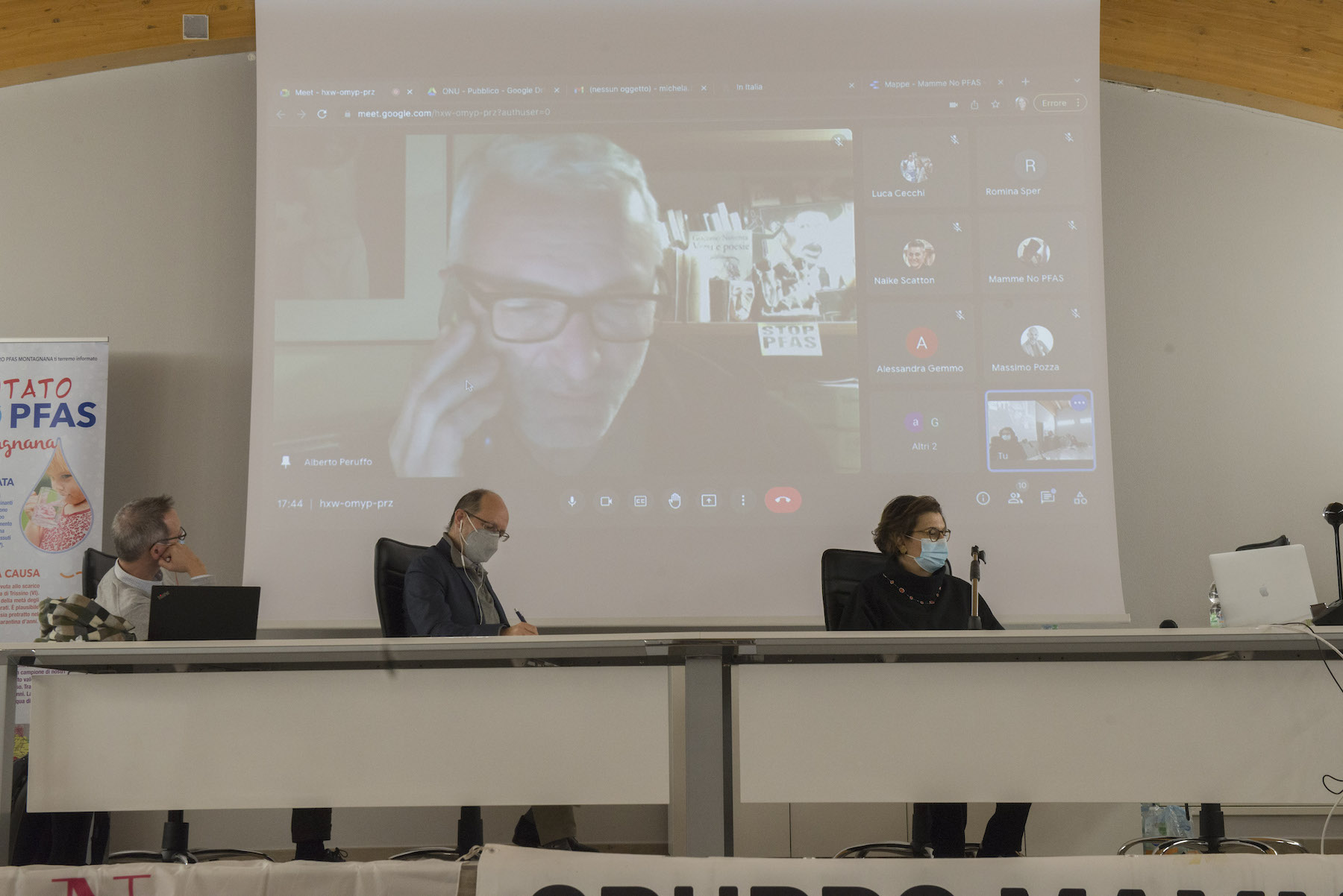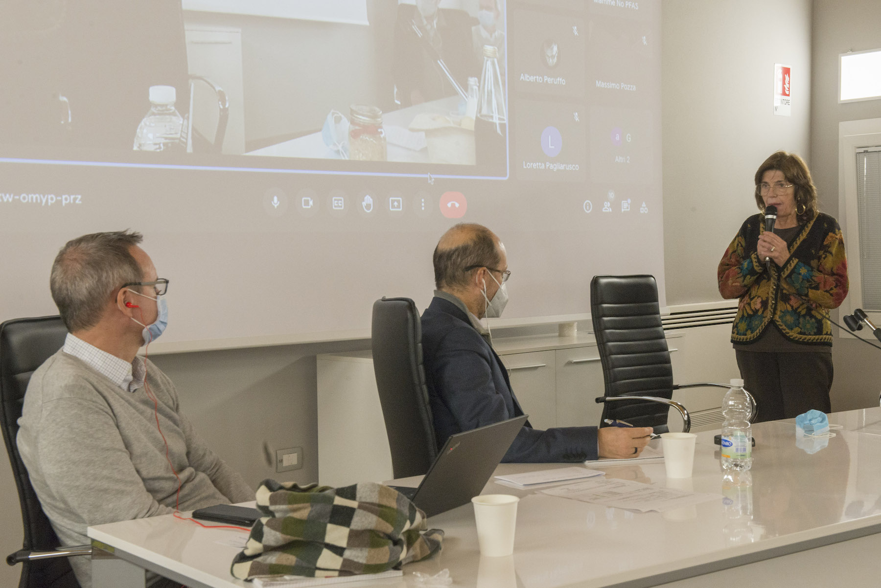 Infine, ricordiamo la chiusura in remoto del regista della Missione ONU, Alberto Peruffo, che dalla sede operativa di PFAS.land – la Libreria La Casa di Giovanni – causa quarantena Covid del figlio – ha ricordato all’assemblea questo punto fondamentale: «Il concetto di corresponsabilità. Sottolineo che un crimine ambientale di così vaste proporzioni può accadere solo se i tre gradi della catena di responsabilità sono fortemente connessi: 1. CHI PRODUCE (la Miteni); 2. CHI PERMETTE (gli enti di permesso: Comune, Provincia e Regione); 3. CHI CONTROLLA (gli enti e le agenzie di controllo: Regione: Genio Civile, Arpav, Spisal, Ulss). Solo questi tre elementi “collusi” insieme possono creare uno dei più grandi inquinamenti della storia recente».