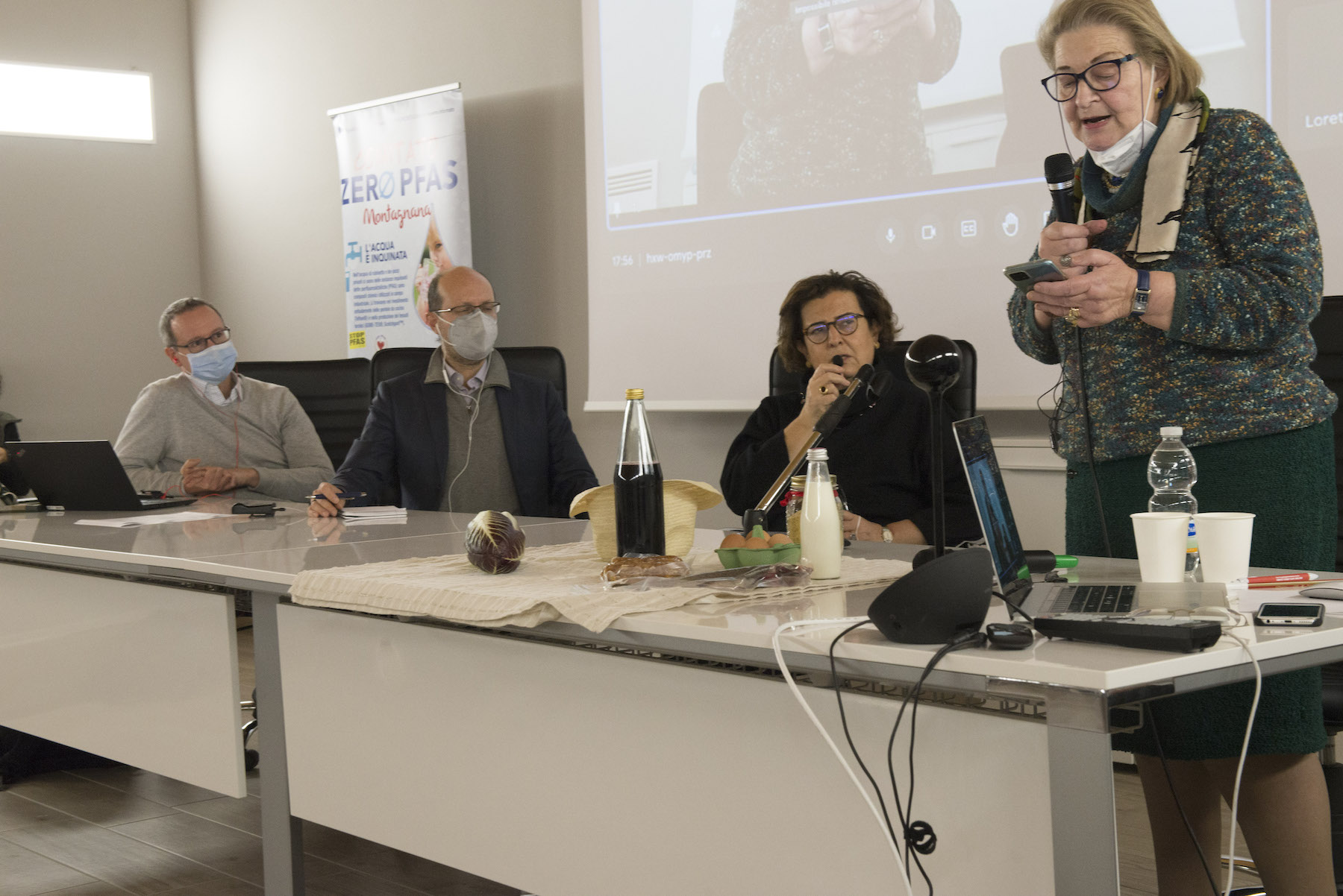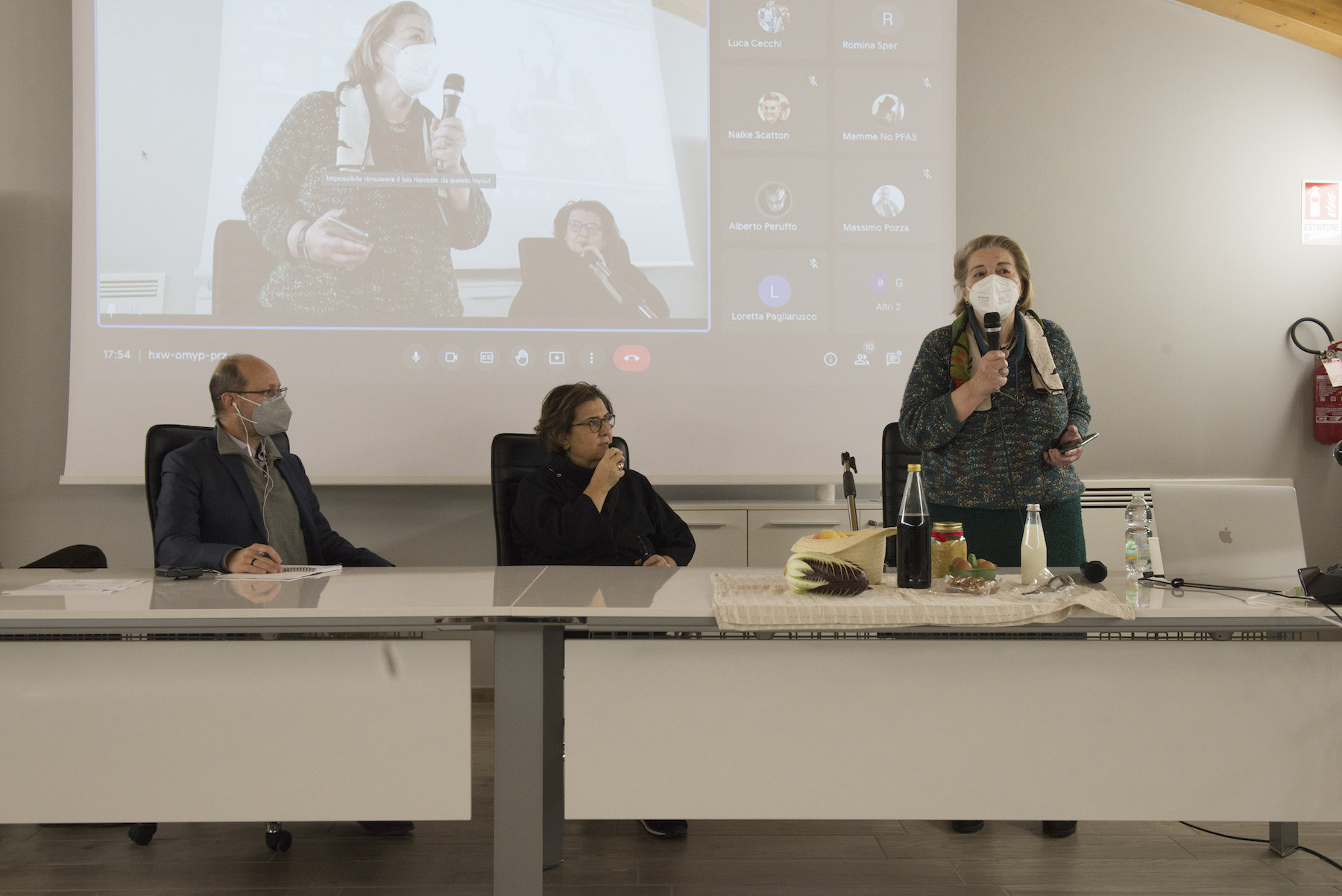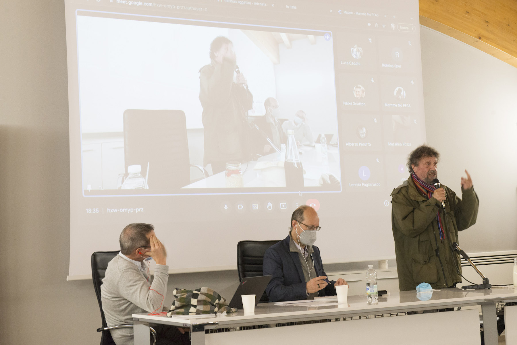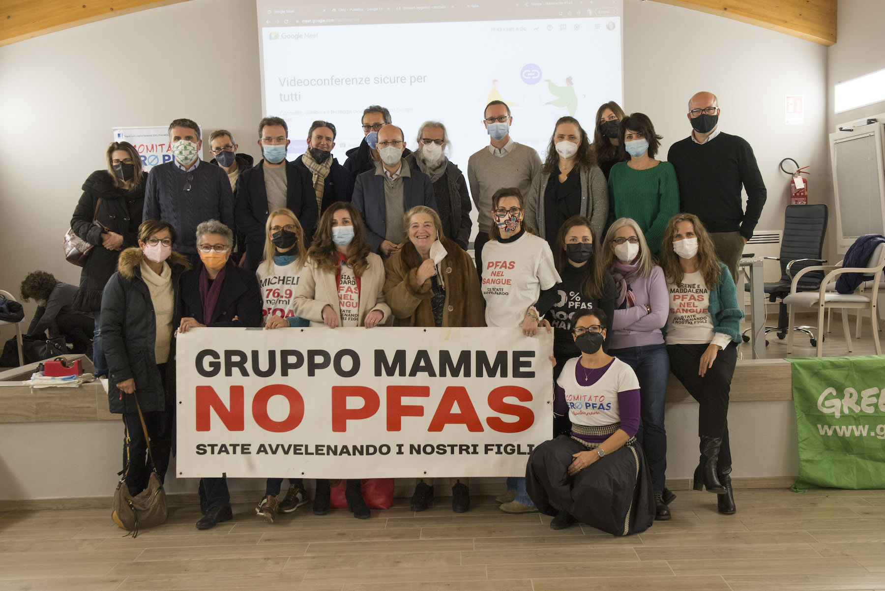 Infine, ricordiamo la chiusura in remoto del regista della Missione ONU, Alberto Peruffo, che dalla sede operativa di PFAS.land – la Libreria La Casa di Giovanni – causa quarantena Covid del figlio – ha ricordato all’assemblea questo punto fondamentale: «Il concetto di corresponsabilità. Sottolineo che un crimine ambientale di così vaste proporzioni può accadere solo se i tre gradi della catena di responsabilità sono fortemente connessi: 1. CHI PRODUCE (la Miteni); 2. CHI PERMETTE (gli enti di permesso: Comune, Provincia e Regione); 3. CHI CONTROLLA (gli enti e le agenzie di controllo: Regione: Genio Civile, Arpav, Spisal, Ulss). Solo questi tre elementi “collusi” insieme possono creare uno dei più grandi inquinamenti della storia recente».