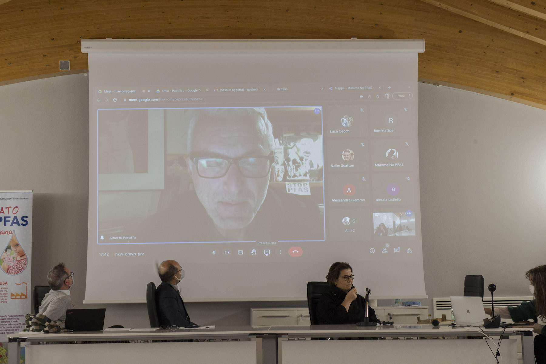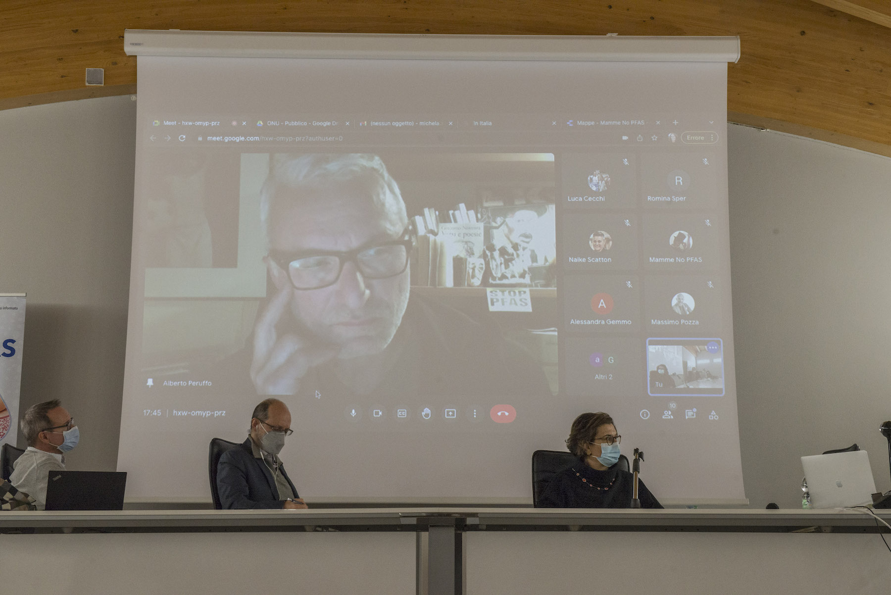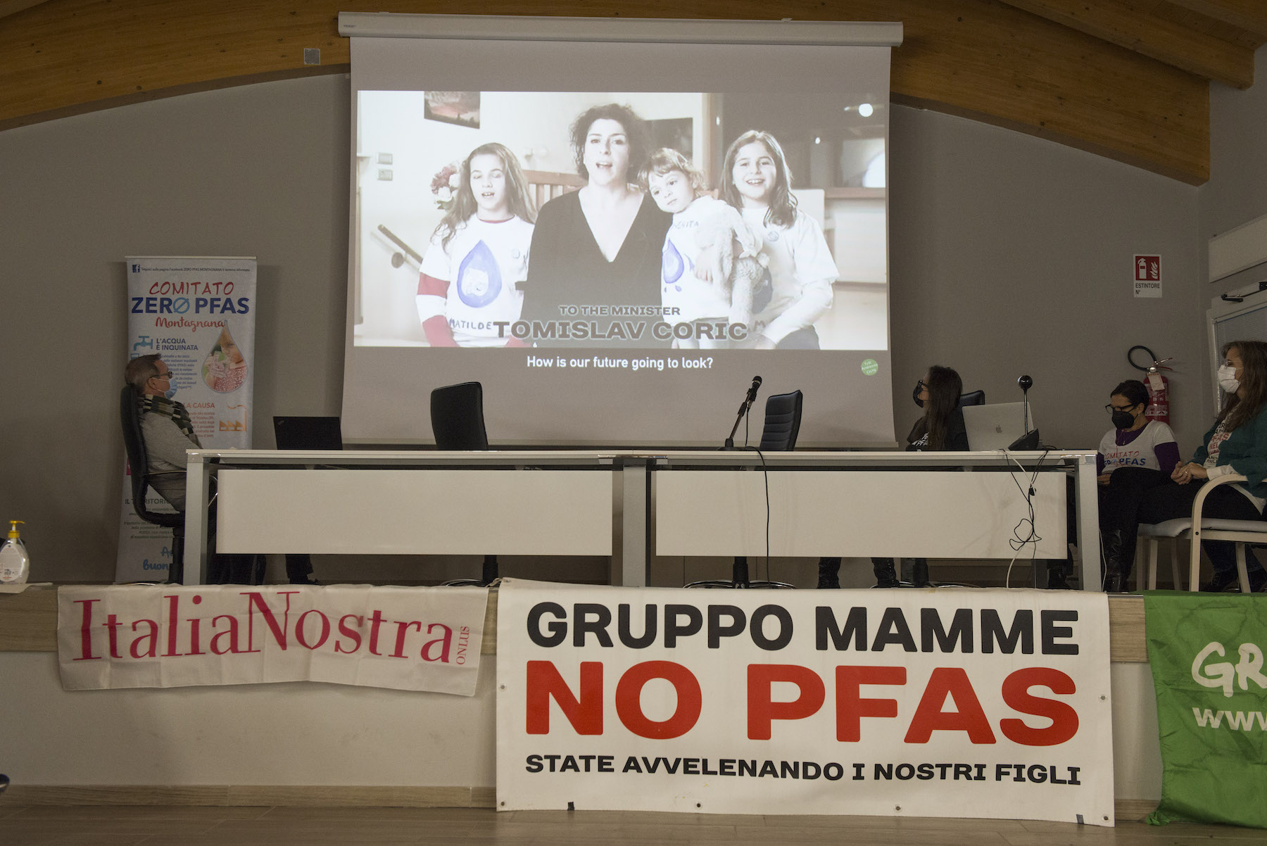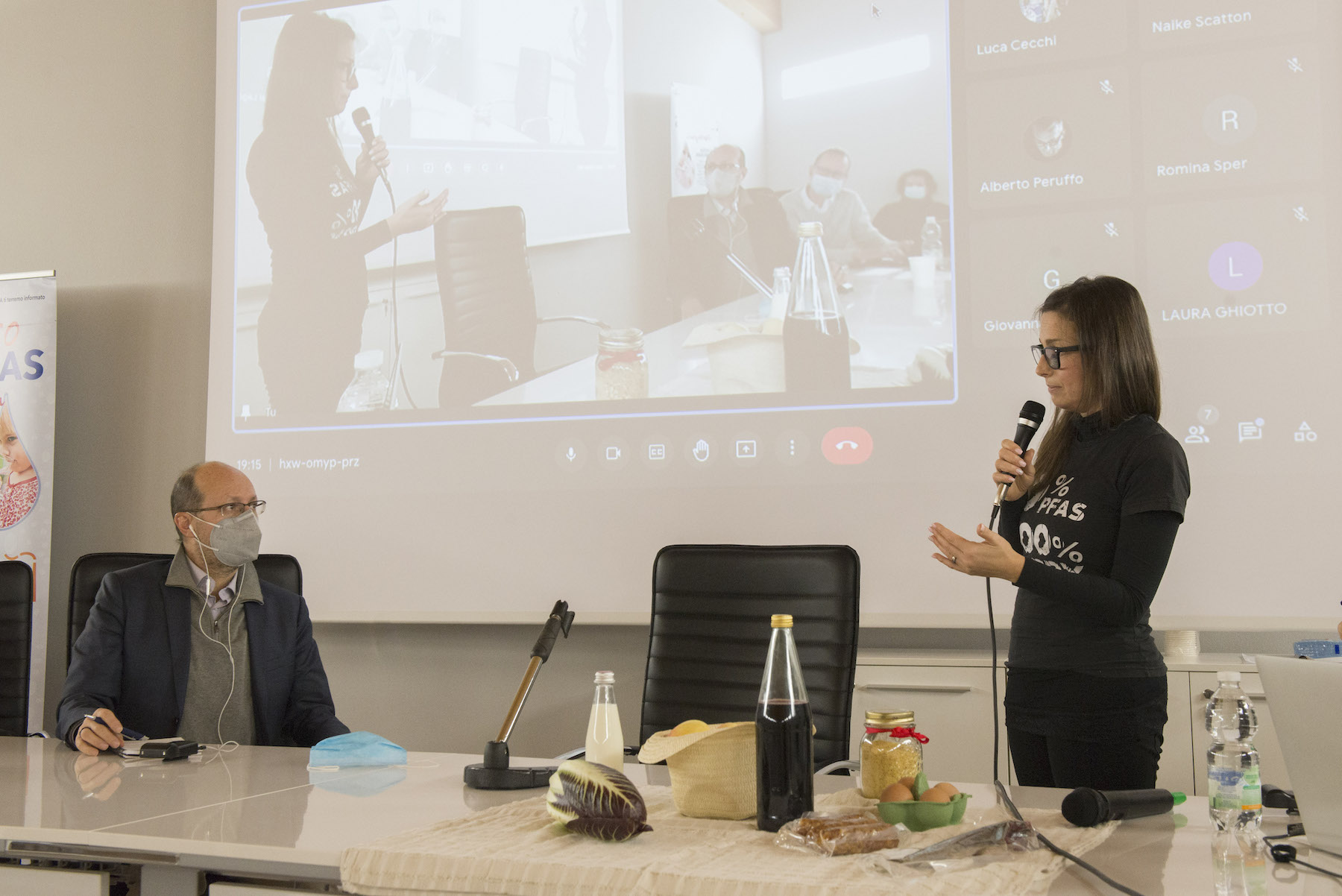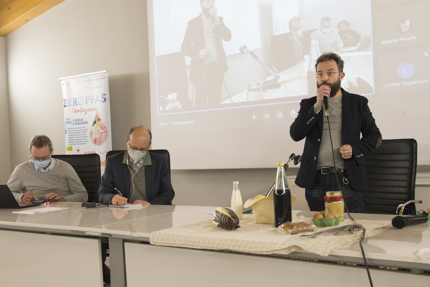 Infine, ricordiamo la chiusura in remoto del regista della Missione ONU, Alberto Peruffo, che dalla sede operativa di PFAS.land – la Libreria La Casa di Giovanni – causa quarantena Covid del figlio – ha ricordato all’assemblea questo punto fondamentale: «Il concetto di corresponsabilità. Sottolineo che un crimine ambientale di così vaste proporzioni può accadere solo se i tre gradi della catena di responsabilità sono fortemente connessi: 1. CHI PRODUCE (la Miteni); 2. CHI PERMETTE (gli enti di permesso: Comune, Provincia e Regione); 3. CHI CONTROLLA (gli enti e le agenzie di controllo: Regione: Genio Civile, Arpav, Spisal, Ulss). Solo questi tre elementi “collusi” insieme possono creare uno dei più grandi inquinamenti della storia recente».