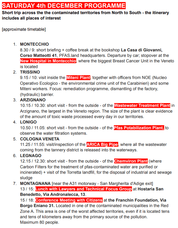 Di seguito il materiale della giornata di “attraversamento dei territori da nord a sud”, le nostre relazioni ufficiali, le sintesi dei nostri interventi e dei nostri commenti a fondamento e a latere della Missione ONU. Ispezione che ha portato la questione PFAS allo stesso livello di nodi oramai storici del crimine ambientale italiano, entrati nell’immaginario negativo della politica nazionale e internazionale: la Terra dei Fuochi in Campania e l’Ilva di Taranto, passando per Porto Marghera e il nodo di Livorno.