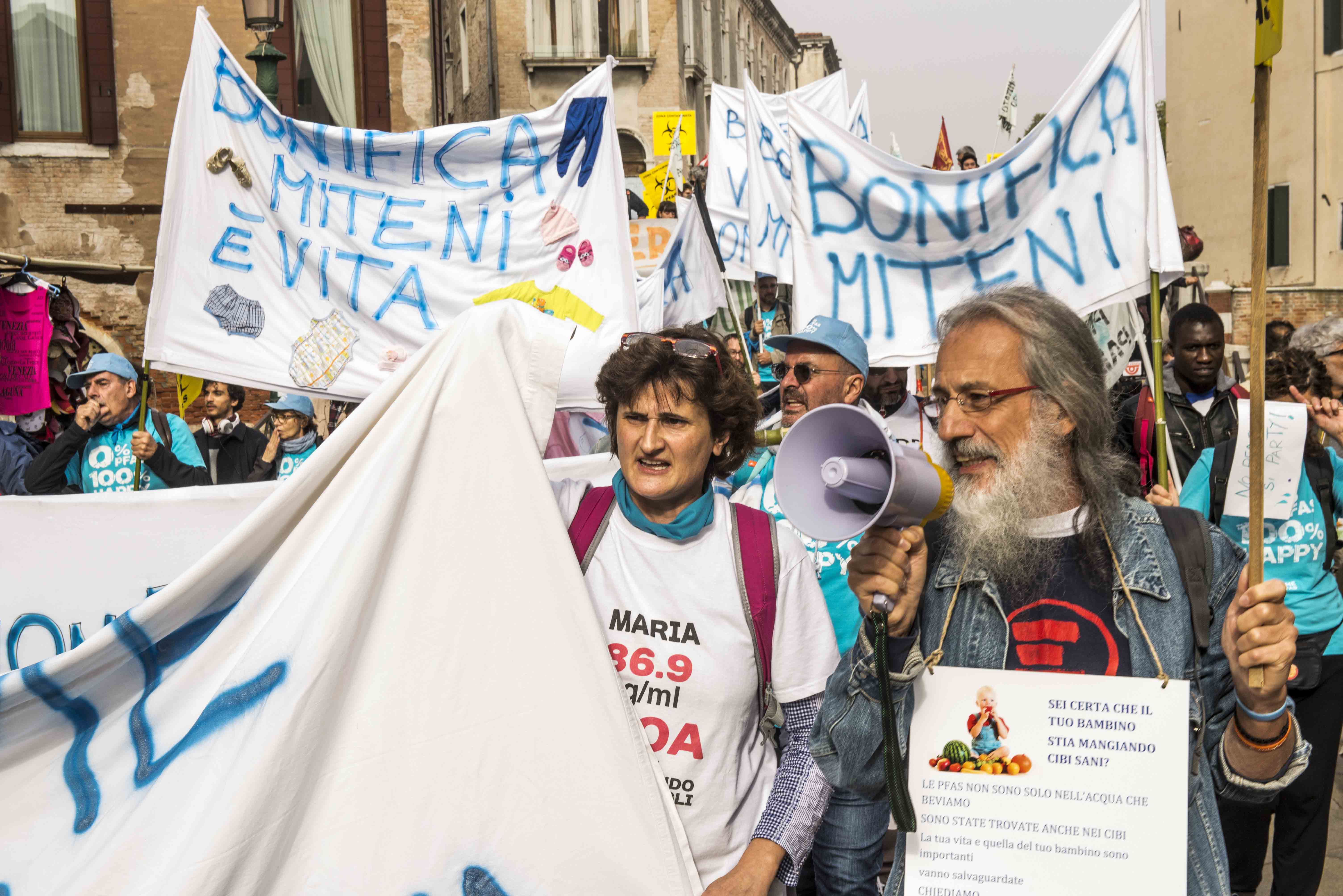 Ad aprile del 2016, nel mentre Medicina Democratica sta per depositare la sua denuncia contro la Miteni che si rivelerà determinante per il futuro processo (v. più avanti), e ISDE (Associazione Medici per l’Ambiente) a Roma presenterà (il 6 maggio) lo studio ISDE-ENEA sull’aumento di mortalità nelle zone contaminate, a Montecchio Maggiore, liberi cittadini coordinati dal sottoscritto cominciano ad organizzarsi ed il 25 aprile lanciano il comunicato della prima grande mobilitazione popolare – la Marcia dei Pfiori – contro i Pfas prevista per la Festa della Mamma, l’8 maggio 2016. Il 28 aprile 2016, a seguito dei primi studi sulla popolazione, il dottor Domenico Mantoan annuncia in una Commissione Ambiente straordinaria in sala civica, sempre a Montecchio Maggiore, la gravità della situazione in Veneto e la necessità di una grande indagine epidemiologica, evocata in toni trionfalistici come la più estesa al mondo. Dirà anche che la fabbrica non deve più stare dove sta, scrivendolo poi in un celebre documento di “allarme sanitario” alle autorità della Regione, “nascosto” per mesi, fino ad un accesso agli atti del giornalista d’inchiesta Marco Milioni che creerà grande clamore contro gli assessori Gianpaolo Bottacin e Luca Coletto, richiamati pubblicamente dal presidente Luca Zaia.