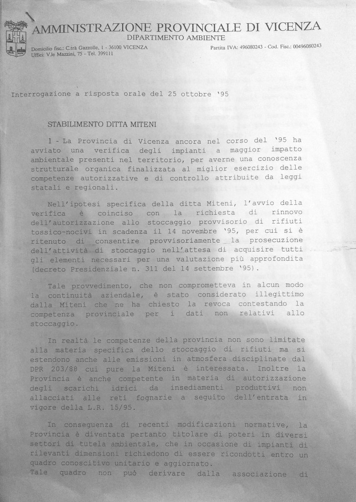 Nel 1994 la Miteni entra a far parte delle «aziende insalubri di prima classe» ed è una delle prime attività industriali del Veneto ad essere sottoposta sotto Direttiva Seveso, con codice NF011. È considerata infatti tra le più pericolose di tutta la regione proprio per la notevole presenza dei fluoroderivati nelle attività in essere o previste. Nel 1995 il consigliere provinciale di Democrazia Proletaria Luciano Ceretta, di Montecchio Maggiore, è il primo politico a presentare un’interrogazione alle autorità preposte alle autorizzazioni ambientali sulla deroga concessa all’azienda per lo smaltimento di rifiuti tossico-nocivi «in conto proprio», ossia a fondo perduto, con scarico diretto delle acque di processo nella Poscola, un torrentello spesso secco. Una deroga di ulteriori cinque anni, dopo il laissez faire degli anni precedenti. La Provincia risponde che non è affare suo, ma della Regione e del Ministero. Tutti si lavano le mani, reciprocamente. Nel 1996 Mitsubishi Corporation acquisisce totalmente la società (91% Mitsubishi, 9% Jemco), aumentando di molto la disponibilità di capitale finanziario transnazionale.