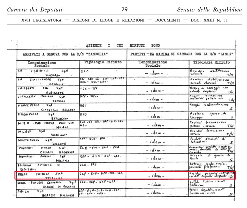 La Rimar interrompe le attività per 14 mesi e viene portata a processo. Il Conte Marzotto sarà assolto con un escamotage giuridico, mentre l’azienda ne approfitta per mettere in atto «un considerevole ampliamento delle celle elettrolitiche». Siamo nel 1979. Per un po’ di anni tutto tace fino al 1985 quando entra in società la ENICHEM SYNTHESIS S.p.A. e qualche anno dopo la MITSUBISHI ITALIA S.p.A. (controllata della MITSUBISHI CORPORATION) per formare una joint venture, la MIT-ENI S.r.l., costituita con atto numero 314626/13821 di repertorio depositato il 7 marzo del 1988 (giorno di uscita di Giannino Marzotto), società che nel 1992 diverrà MITENI S.p.A., la protagonista di questa storia. Sono gli anni grigi del passaggio da Rimar a Miteni, anni in cui vengono interrati rifiuti lungo la Poscola e il nome della Miteni compare tra i carichi delle motonavi tedesche Linix e Zanoobia che trasportano peci fluorurate verso l’Africa e il Sudamerica. L’ombra della mafia internazionale e del traffico criminale di rifiuti tossici sfiora l’azienda, che continua tuttavia a produrre indisturbata, anche dopo il passaggio di proprietà. Ma le norme ambientali stanno per cambiare.