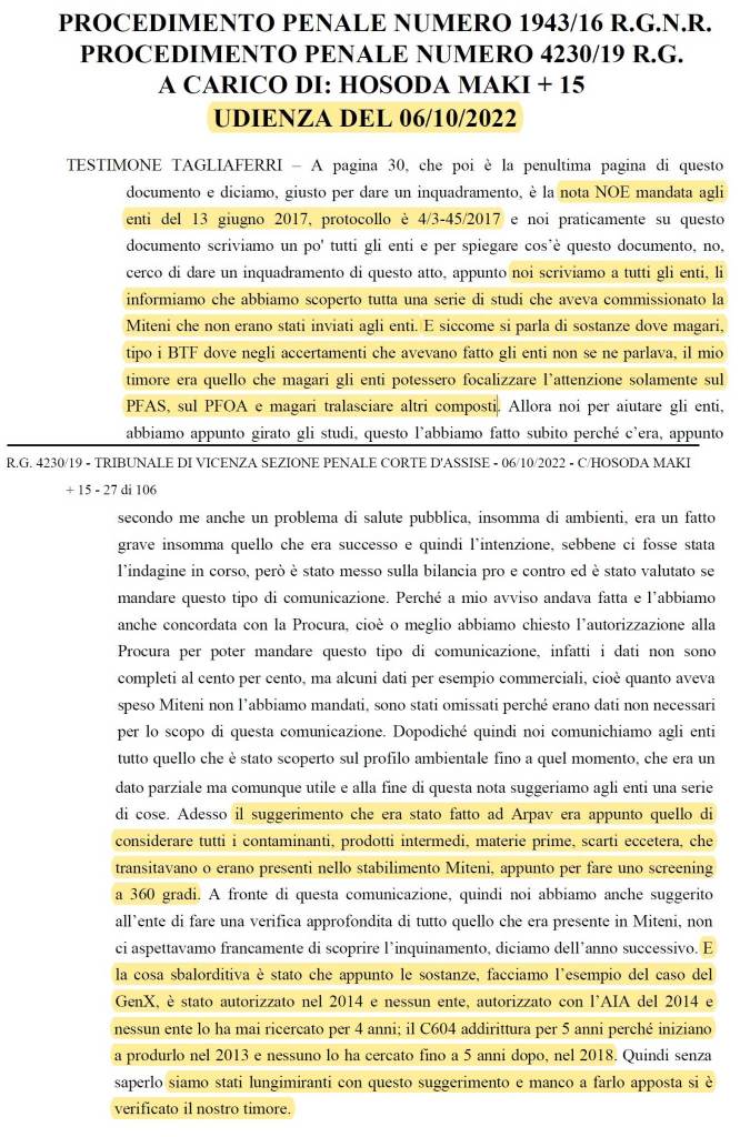 Poco dopo, nel marzo 2017 parte la monumentale indagine del NOE di Treviso, condotta dal maresciallo Manuel Tagliaferri, aperta da una denuncia penale depositata dall’avvocato vicentino Edoardo Bortolotto di Medicina Democratica e dalla montecchiana Sonia Perenzoni del Movimento 5 Stelle, l’8 aprile del 2016, esposto 1943/2016 preso in carico dai procuratori Barbara De Munari e Hans Roderich Blattner. Promotrice della dettagliata denuncia sono i responsabili provinciali e nazionali di Medicina Democratica, Maria Chiara Rodeghiero e Marco Caldiroli. I nuovi limiti “regionali” ai Pfas saranno messi subito dopo.