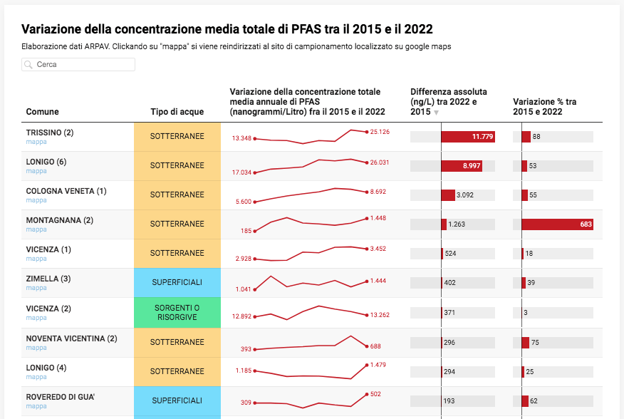 Utile a capire i cosiddetti “costi dell’inazione” citati nell’articolo – ricordiamo che non esiste progetto serio di bonifica del sito Miteni a 10 anni dalla “scoperta” ufficializzata dei PFAS – pubblichiamo in anteprima alcune mappe di visualizzazione create da Felice Simeone, ricercatore CNR, basandosi su dati ARPAV. Da sottolineare nella prima, che mostra la variazione di concentrazione PFAS negli anni 2015-2022, l‘aumento della contaminazione in diversi comuni a rischio del Veneto. La seconda invece – zoomabile/navigabile – mostra graficamente (mediante proporzionalità dei cerchi e diversità cromatica) i valori recenti della stessa contaminazione. In entrambe le mappe si può entrare nel dettaglio georeferenziato dei dati, andando a vedere le coordinate puntuali di ogni singolo dato, come per il nostro primo pionieristico GIS. Preoccupanti i dati in molti Comuni della zona rossa, e non solo, come a Sarego, che su un totale 42.725 ng/lt ha 8.900 ng/lt di PFBA, lo stesso composto riscontrato a Castelgomberto usato per gli “acceleranti del cemento” durante i lavori della Superstrada Pedemontana Veneta. L’ipotesi di sversamenti di opere a monte, come i “cantieri TAV”, o altro, necessita di verifiche urgenti. Dalle mappe si evince che queste “zone di sacrificio ad alto reddito” del Veneto non sono più sicure dal punto di vista della vivibilità e che di fatto invece di migliorare nel tempo sono oggetto di una devastazione ambientale oramai irreversibile. Devastazione frutto di scelte politiche.