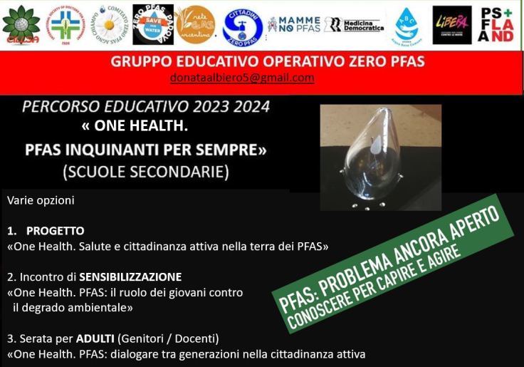 Il nostro cammino educativo prosegue nell’anno scolastico 2023/2024, con varie proposte. Ci accompagnano le parole incoraggianti di un preside vicentino, tramite una e-mail istituzionale arrivatami in questa afosa estate: «Buongiorno dott.ssa Albiero. Ho letto con interesse la sua relazione. E faccio i complimenti a lei e a tutte le persone che si prodigano per far conoscere agli studenti delle nostre scuole il grave problema della contaminazione da Pfas di territori importanti della provincia. Nonostante le difficoltà che si incontrano quotidianamente, i tentativi di insabbiare tutto, l’omertà e l’indifferenza della politica locale, nazionale e internazionale su questo e tanti altri problemi che minano la salute del pianeta, noi continuiamo a credere nelle nuove generazioni. Buona estate e arrivederci al prossimo anno».