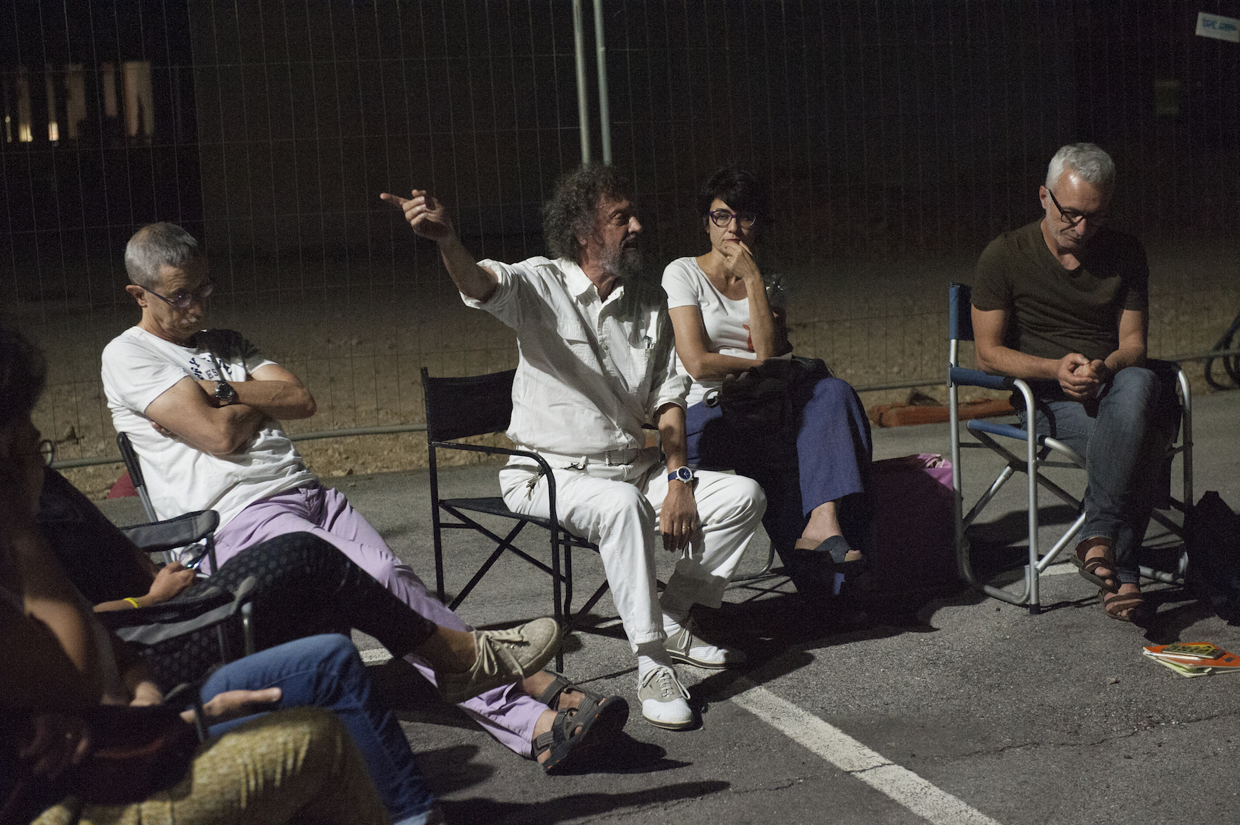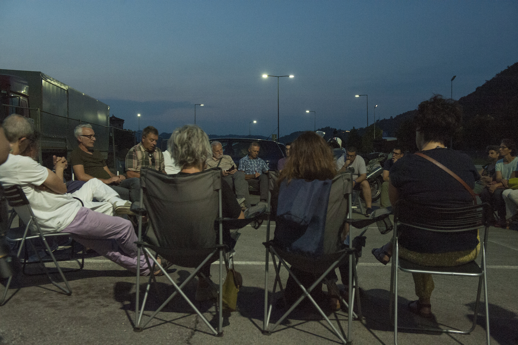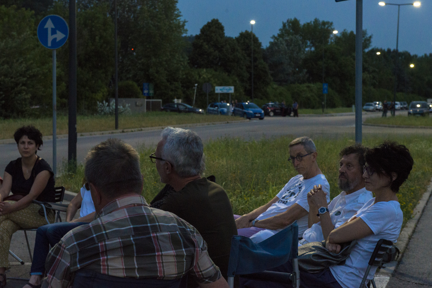 Assemblea del Movimento No Pfas sulla strada, fronte Miteni, il 17 giugno 2019, durante la quale si approvò il Progetto Scuola 2019-20. Da notare sullo sfondo la forte presenza delle forze dell’ordine. Foto di Federico Bevilacqua.